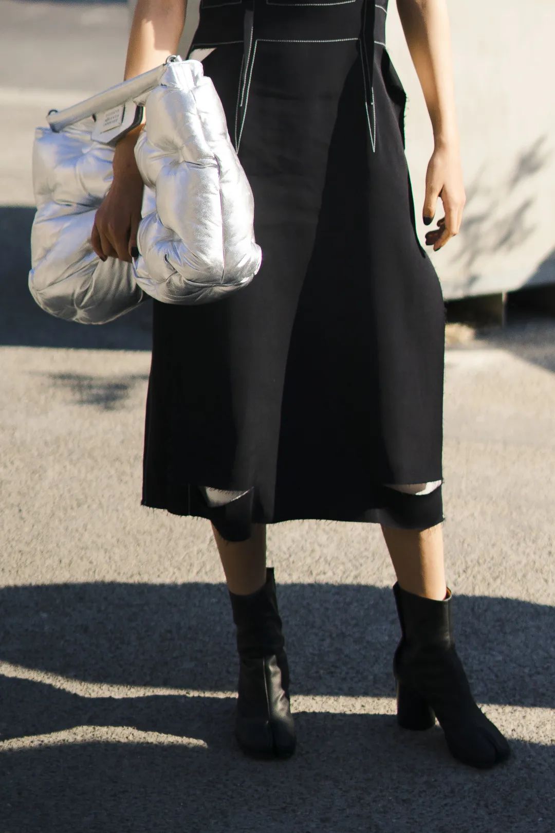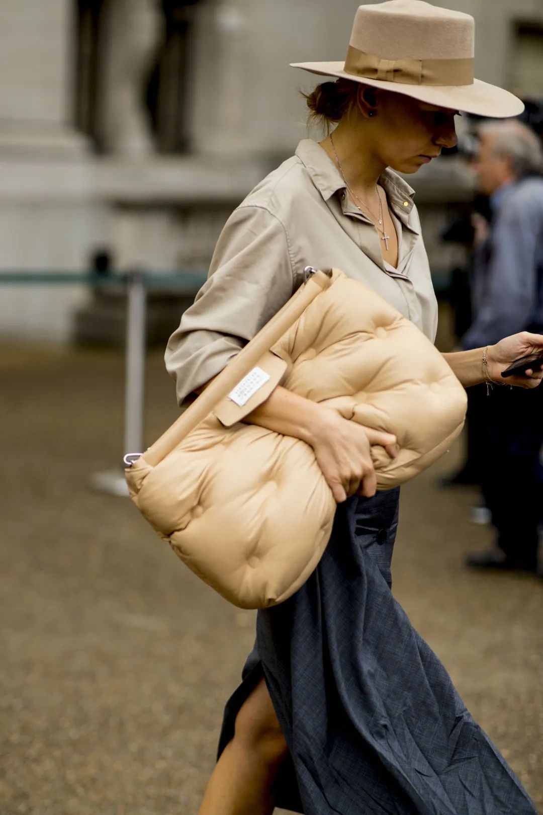 如果擔心尖頭鞋會稍微過於強勢,擔心會產生讓人不易於接近的距離感,那麼完全可以用一隻圓鼓鼓的包包來中和一下整身look的氣場。看起來就是個有趣到極致的靈魂吧!那就不得不想到“穿著羽絨服”的Maison Margiela啦!一直堅持解構式剪裁的硬核品牌,專注打破平庸六十年。經典的寬絎縫的設計,軟綿綿、胖嘟嘟蓬鬆柔軟輕巧,既時髦又實用,裝飾感又滿分。