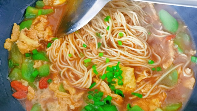 4、鍋裡再次煮開時下入麵條,煮熟後關火加蔥花出鍋。