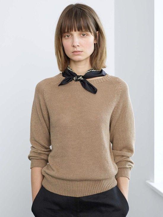 焦糖色的毛衣顏色濃郁復古,寬大的輪廓可以穿出毛衣的慵懶歲性感,下裝是白色的直筒半身裙,前開叉的設計讓裙子不會顯得死板,鞋子也是複古風的咖啡色皮鞋,系上暗橘色的絲巾相得益彰。