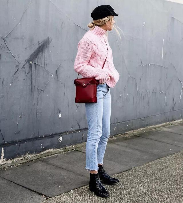 配色方面,黑色毛衣加上黑、白或深藍色牛仔褲都很簡約高級,灰色毛衣配淺藍牛仔褲也很顯氣質。紅毛衣、綠毛衣則適合搭配顏色深藍一點的複古直筒牛仔褲,一定要將毛衣下擺塞進褲腰,打造利落優雅的感覺。如果是粉色毛衣,牛仔褲最好選擇淡淡的、帶有灰色調的淺藍牛仔褲,看上去會比較高級。