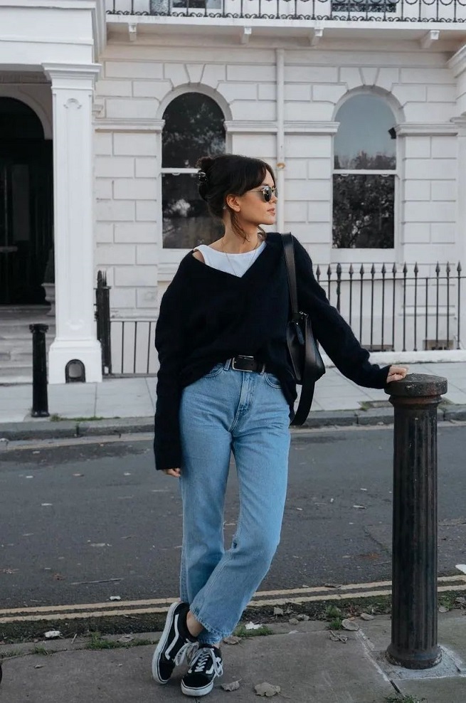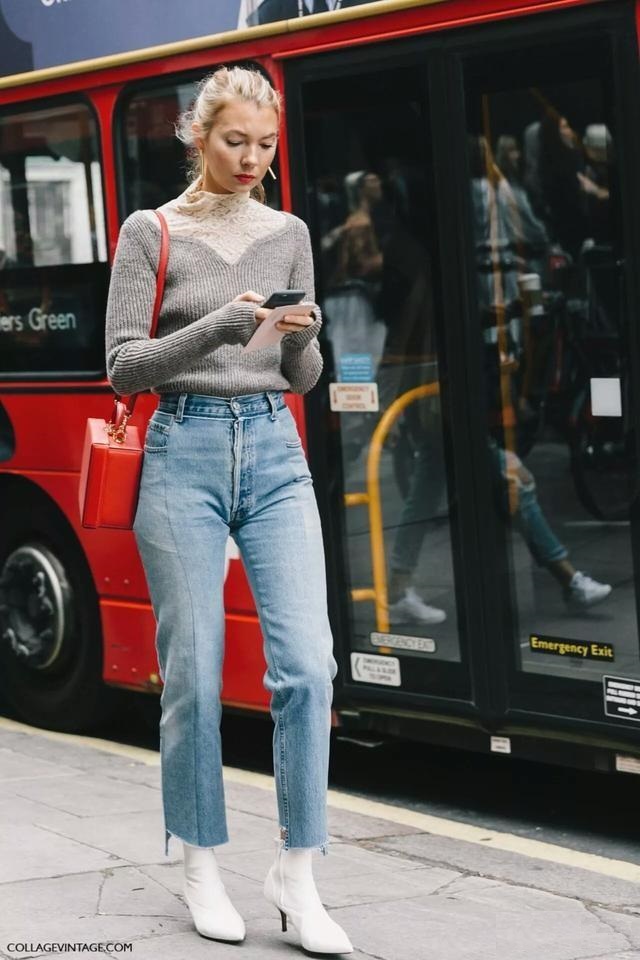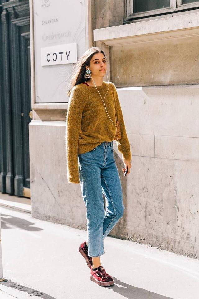 毛衣搭配牛仔褲想要呈現時髦高級感,一定不能夠拖沓,要避免一種邋遢的感覺。如果毛衣很寬鬆,特別是厚實的oversize大毛衣,很容易顯胖顯臃腫,那麼搭配的牛仔褲就一定要選修身一點的款式,強調腿部的線條,才能顯瘦。