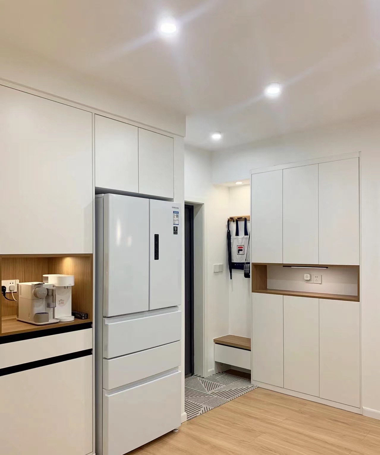 定制了櫥櫃,吊櫃是無把手設計,視覺上與牆面更有整體性,弱化了櫃體的壓抑感。
