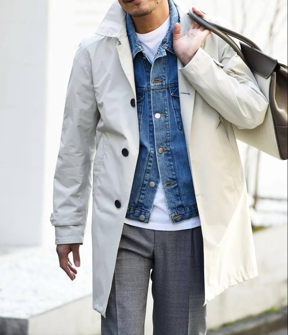 風衣給人的感覺硬挺有型的,跟硬朗的牛仔外套,搭配起來和諧度會更高一些。