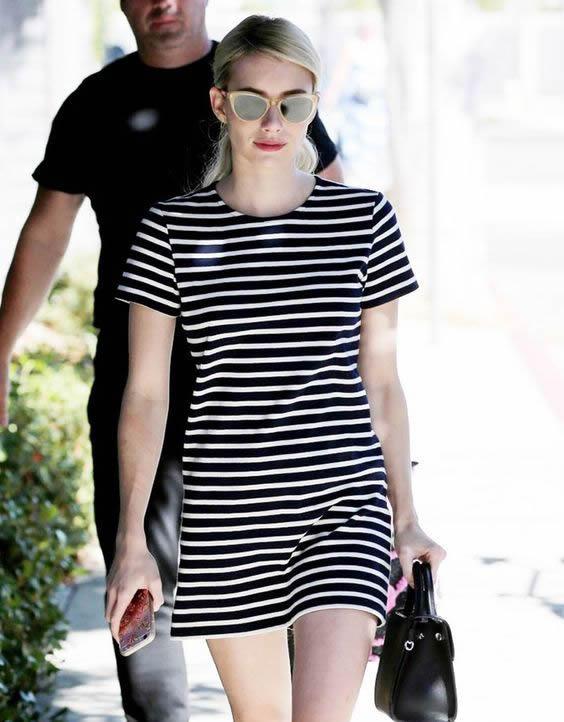 當然,合身與修身的概念不同。有些衣服需要適當的寬鬆,才能展現風格特點。比如,下圖中的條紋連衣裙,就不適合過於緊身。