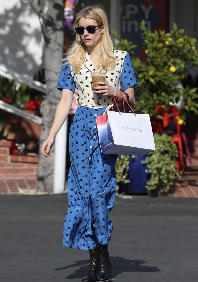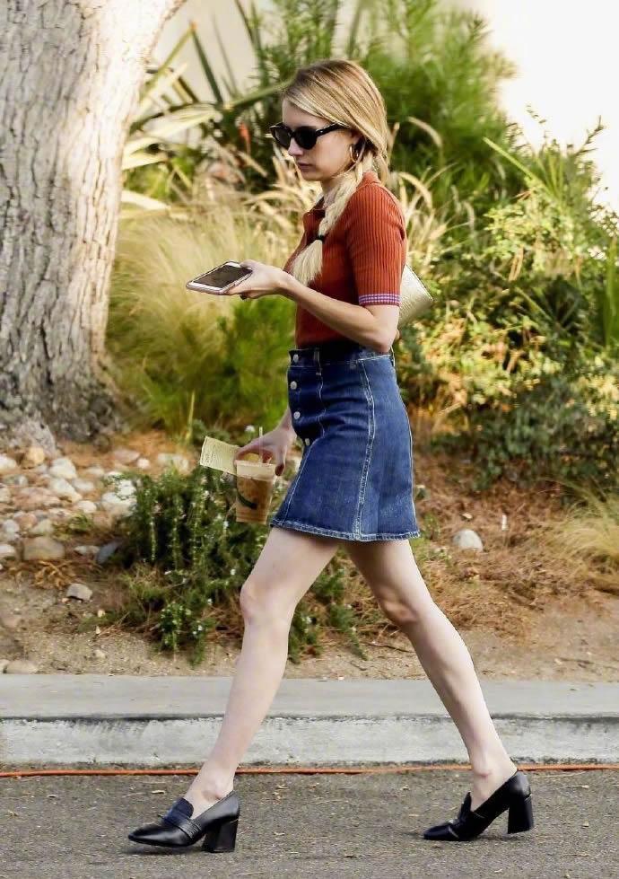 艾瑪的很多私服搭配,都是超短膝上裙配各類撞色鞋靴,一點都不突兀。