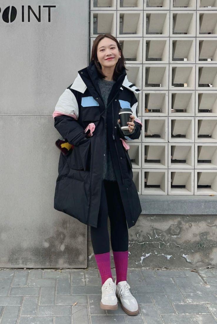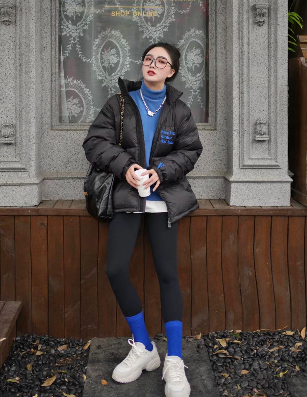 露襪穿的穿法,其實是比較考驗時尚功底的,尤其是這種緊身褲的搭配,如果我們選擇的上衣不符合穿衣條件的話,那麼,整體的造型都會翻車。如果你的身高不佔優勢的話,那麼,在搭配緊身褲和筒襪的時候,建議可以選擇一件短款羽絨服,疊穿遮臀長度的衛衣更顯高。