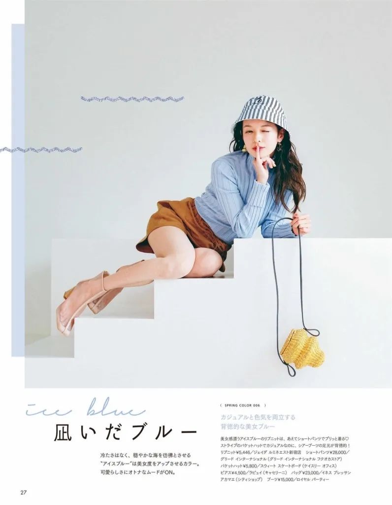 帶著一絲冷意冰冰的淡藍色跟薄荷綠一樣,能夠給人帶來清涼的感覺,而且還能將膚色映襯的透亮白皙,針織衫、半裙,大色塊的冰藍色,養眼又低調。