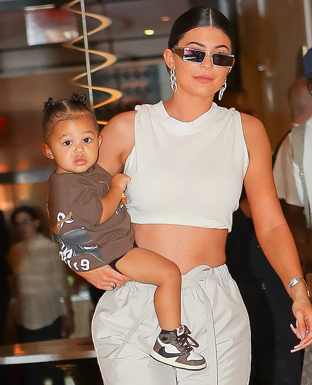 凱莉·詹娜臀部穿了件斯托米禮服,展現了她健美的腹部。迷你版的凱莉穿著一件超大號的t卹,頭髮向後梳成可愛的髮髻。