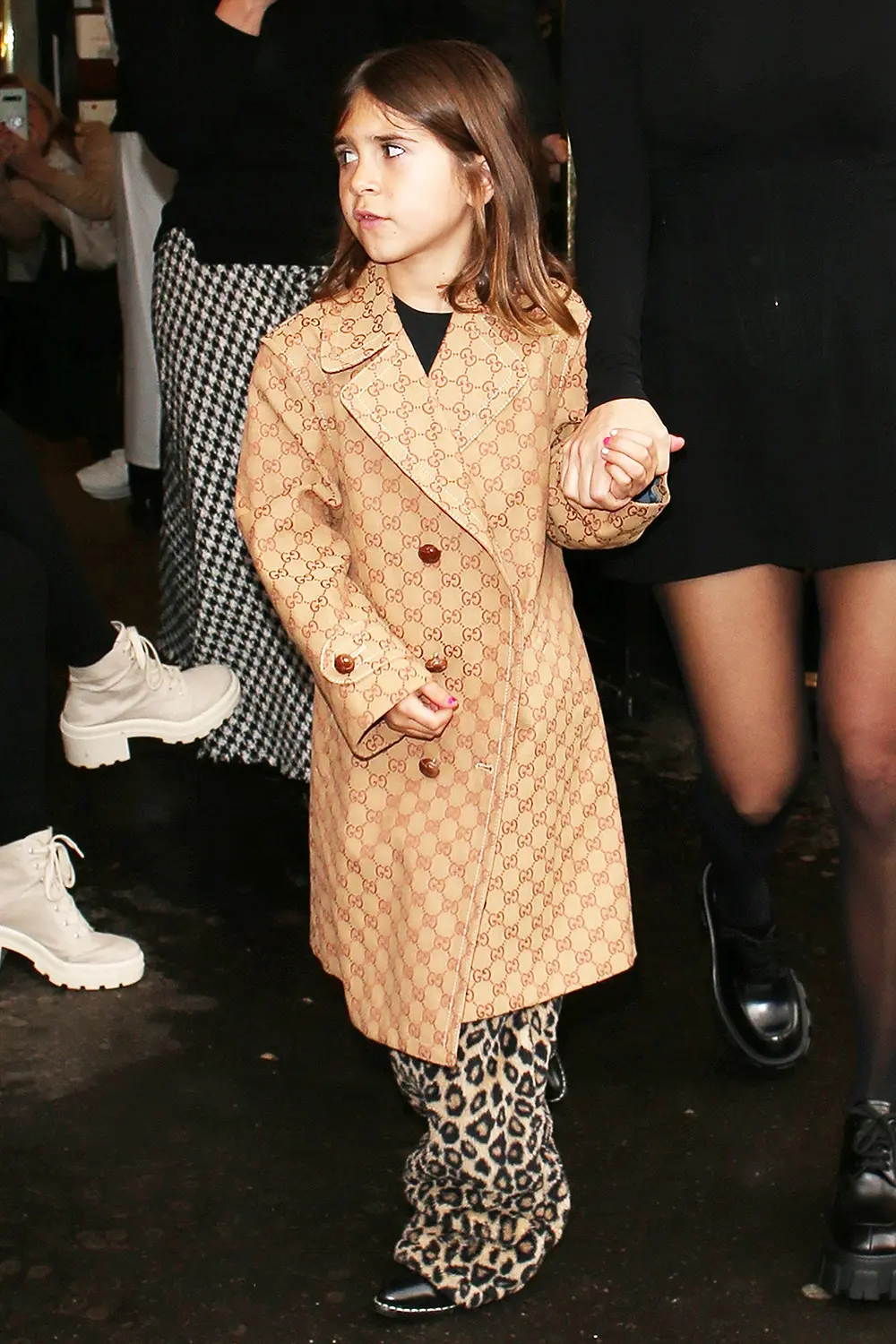 佩內洛普·迪斯克是卡詹納家年齡最大的孩子之一,她開始形成自己的風格。圖為她在巴黎時裝週上身穿設計師風衣和豹紋褲。