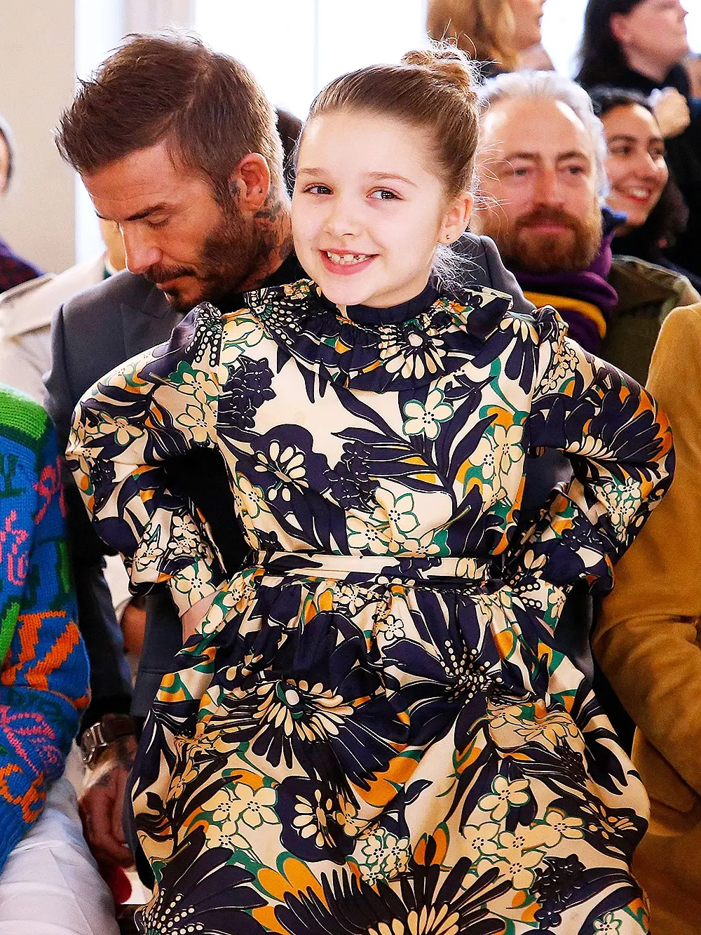 媽媽是維多利亞·貝克漢姆的小七,有很強的時尚感。在倫敦時裝週上,小七穿著印花裙坐在爸爸的膝蓋上,露出燦爛陽光的笑容。