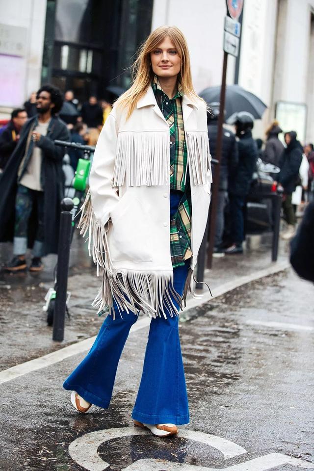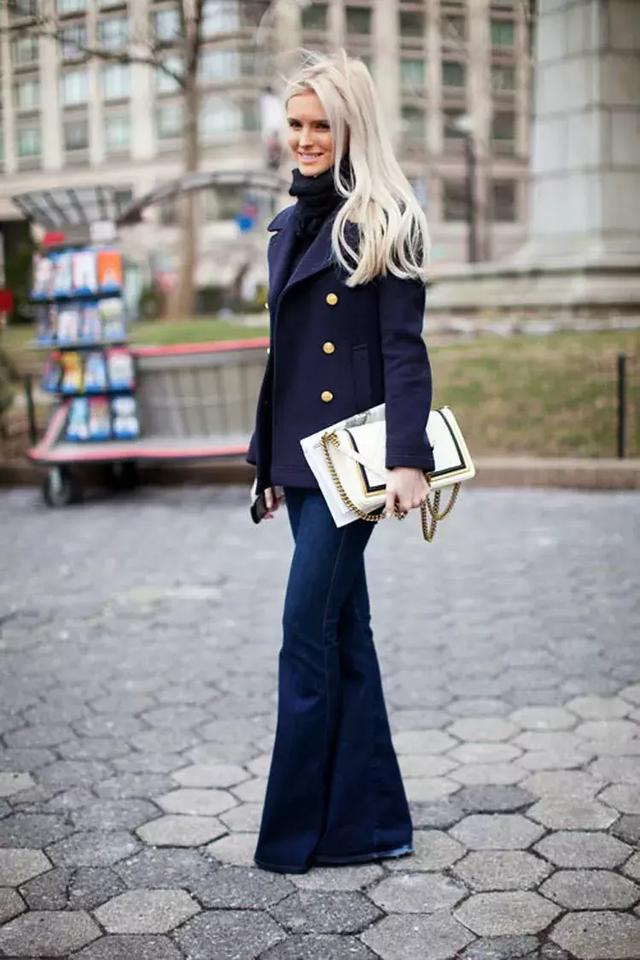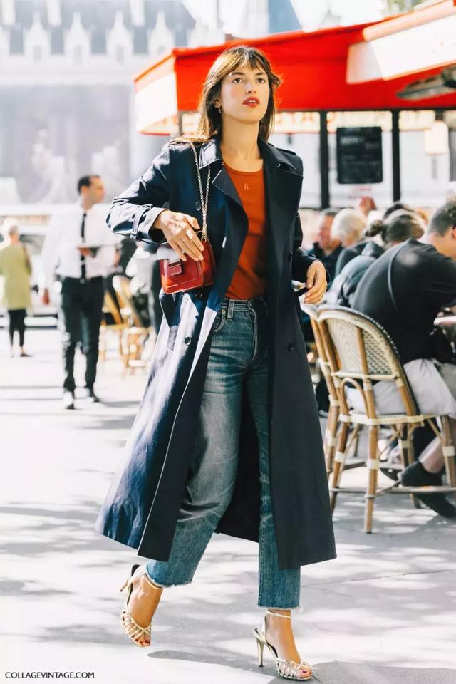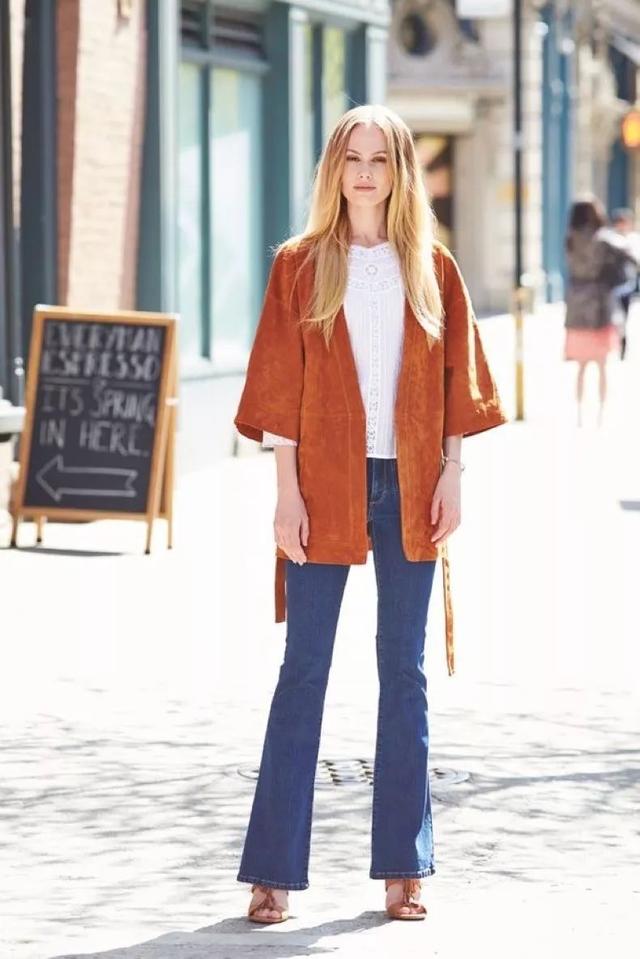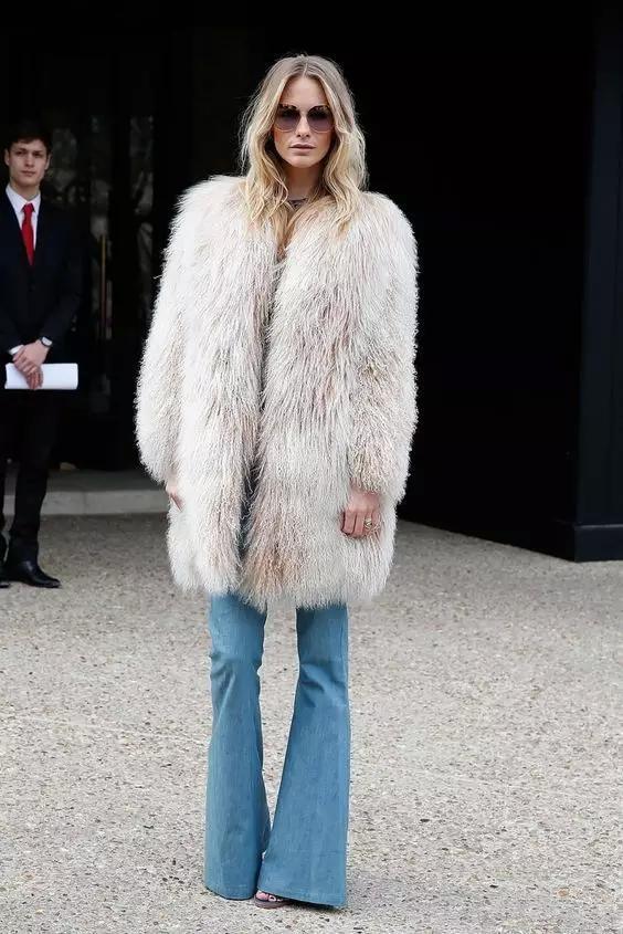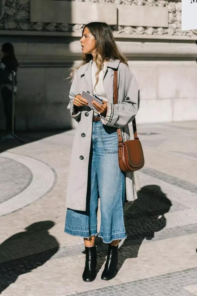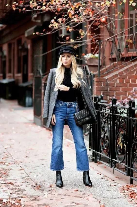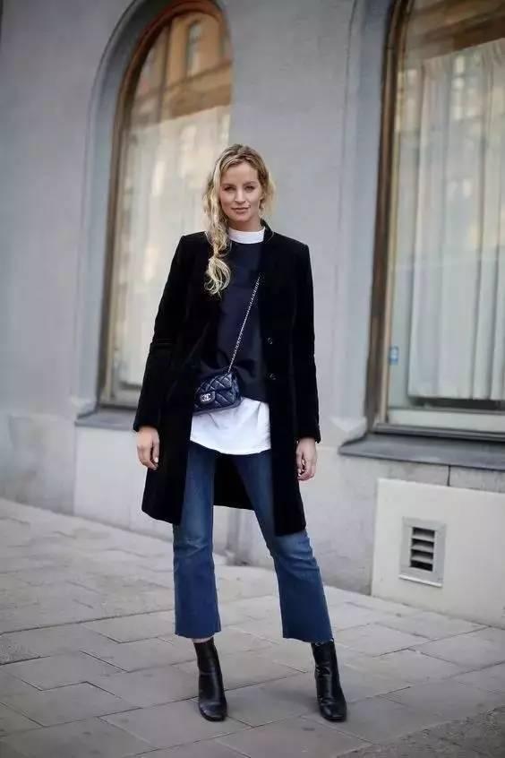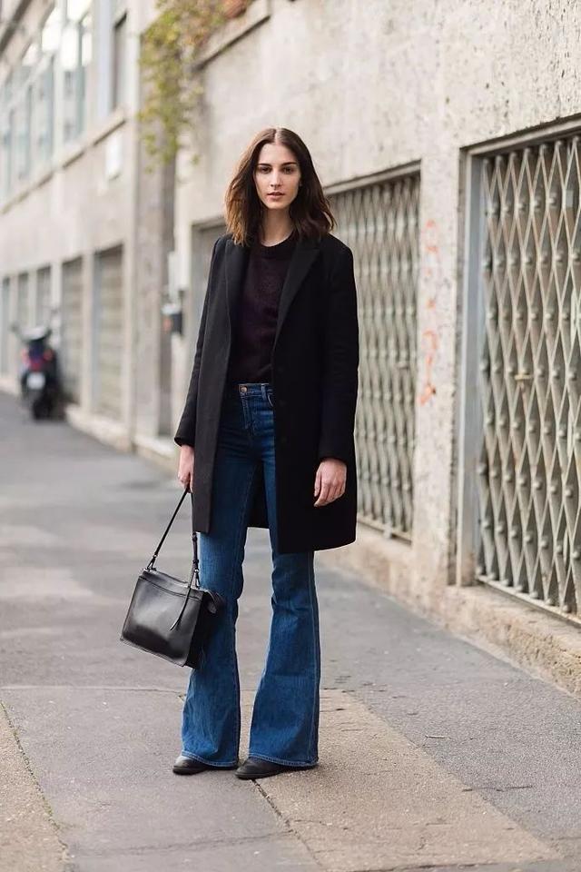 牛仔喇叭褲搭配大衣復古年代感巨顯,尤其是立馬讓腿長了5cm!這個時候褲底的喇叭造型設計越明顯越帶感,微喇就要遜色就很多了!