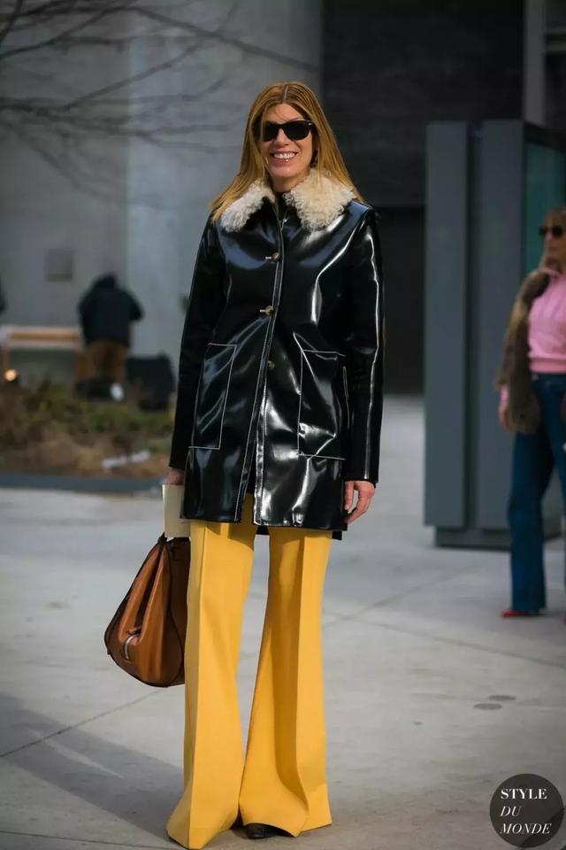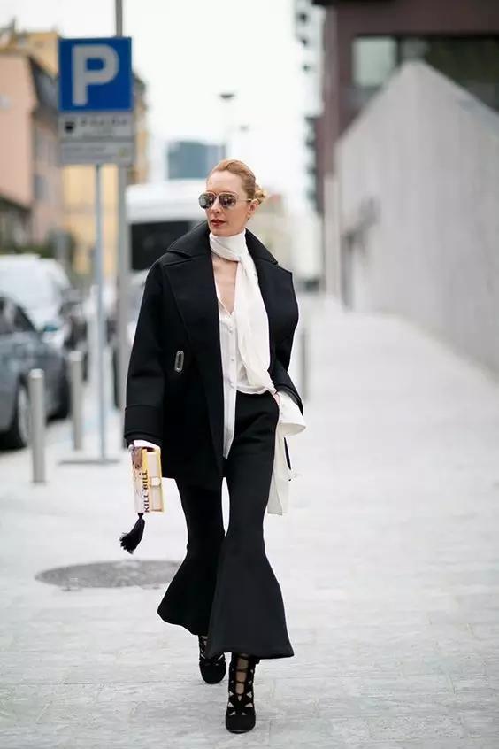 黑色牛仔喇叭褲搭配黑色大衣順色搭配,要想整個look不死板,一定要在單品配色上下功夫,內搭選擇亮色會讓整個造型亮眼不少!