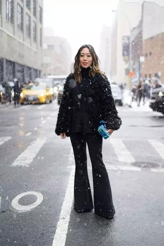 建議:長款喇叭褲配短款外套顯高,短款配厚重外套顯瘦!