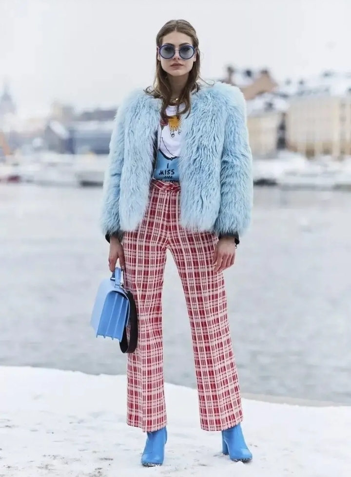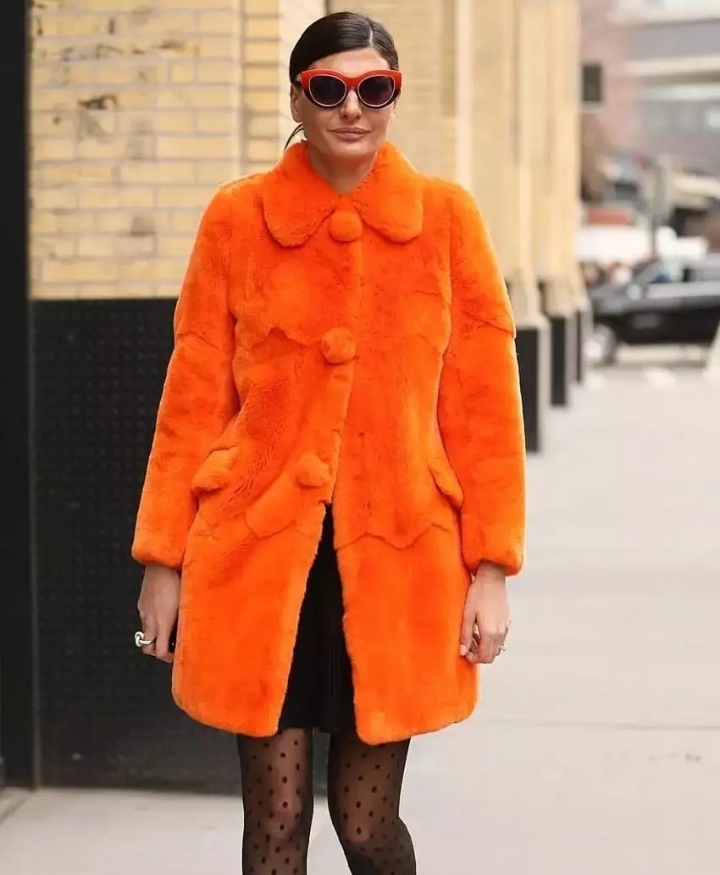 顏色鮮豔的皮草大衣顏色鮮亮、飽和度高,給人一種譁眾取寵的感覺。皮草大衣本身就厚重,鮮亮的顏色則更是從視覺上加深了衣服厚重感,很容易將人襯的臃腫肥胖,更加的顯老和油膩。