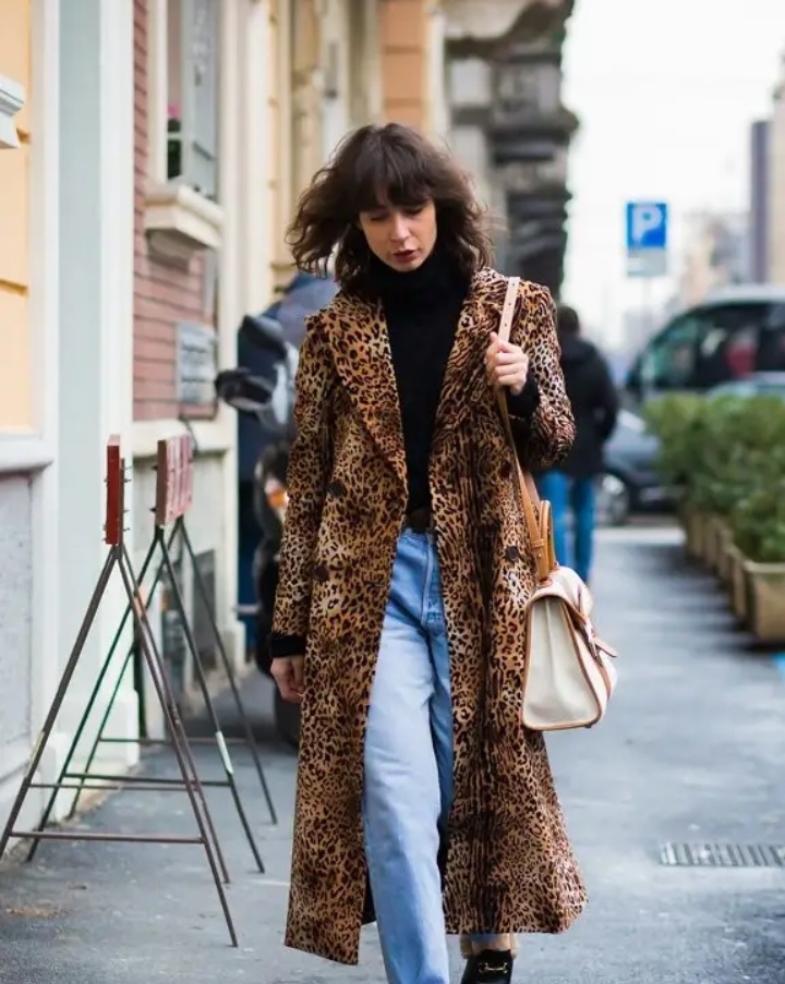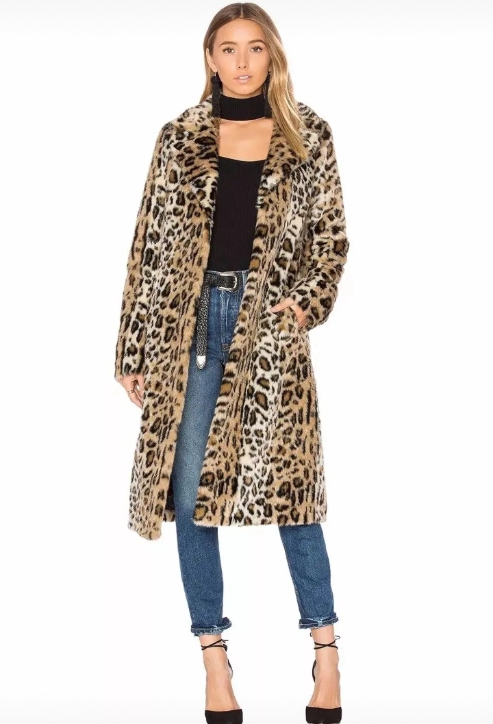 除了純色的皮草大衣之外,豹紋也是近幾年十分流行的一種時尚元素。雖然豹紋元素頗有些張揚,但是因為結合了皮草的材質反而增加了貴氣感,從而使得這類服裝更加的合理化,不會顯得過於的誇張和妖艷。搭配一條經典的牛仔褲和一雙基礎款高跟鞋,盡顯酷炫和瀟灑的氣質。
