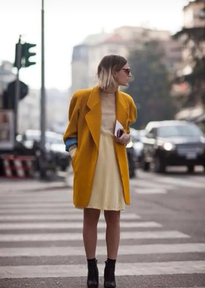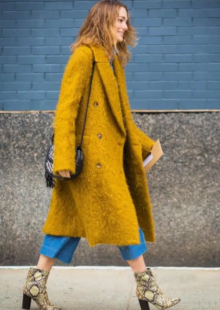 大地黃是很多女性都會中招的一個顏色,這種顏色以黃色作為主調,但是卻透露著一種灰濛蒙的感覺,是一種容易讓人誤認為凸顯成熟的顏色。大地黃在大衣中比較常見,如果不是膚色過於白皙的女性,就還是不要選擇了,因為它極其的顯黑並且不容易搭配,同時會讓人看起來過於的成熟。