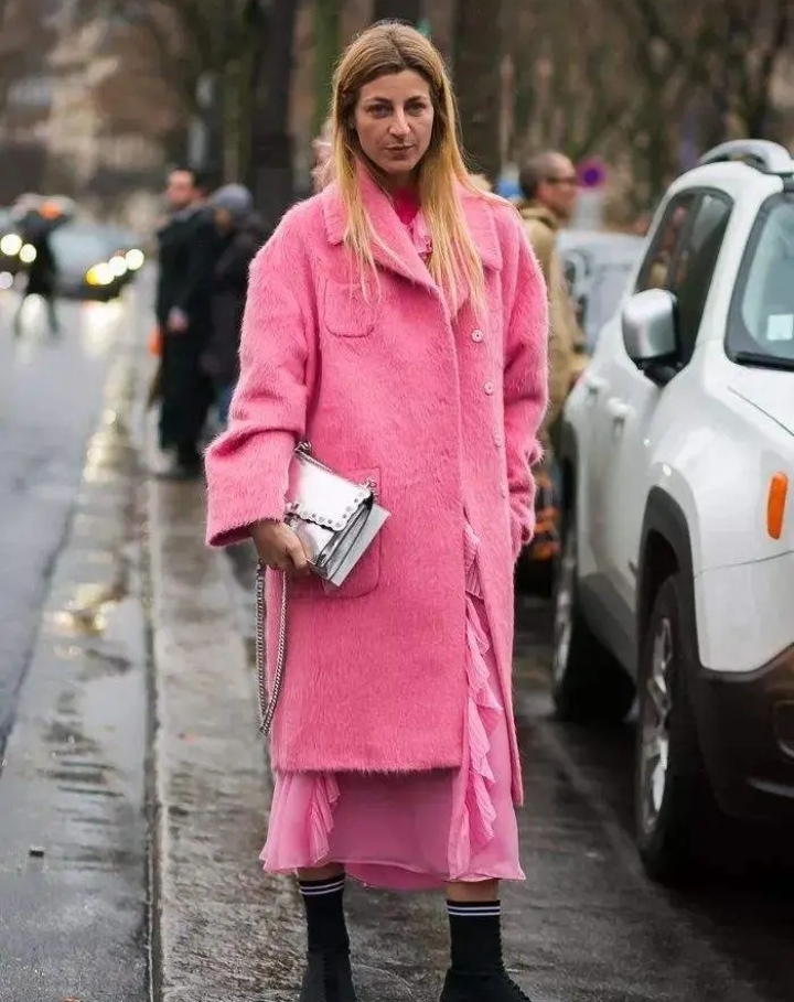 芭比粉色的大衣飽和度過高,將人的膚色會襯的更加的暗沉,無論你膚色有多麼的白,都不要輕易嘗試,因為穿上它整個人似乎都處在發光的道路上。其他類似於芭比粉這樣的飽和度較高的紅色係也盡量不要嘗試,不但不容易搭配,還會顯得整體造型很廉價,顯黑又顯土。