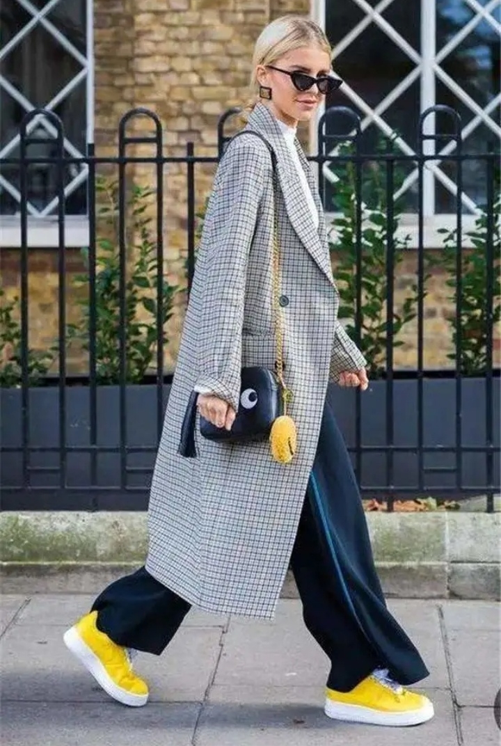 經典的黑白兩色的棋盤格大衣顏色簡單而清爽,在起到保暖作用的同時還展示了一種輕盈感,消退了秋冬季帶給人的厚重感和臃腫感。搭配一件素色的修身毛衣和黑色的休閒褲與大衣的簡約風相呼應,將女性的隨性和瀟灑利落的展現出來。
