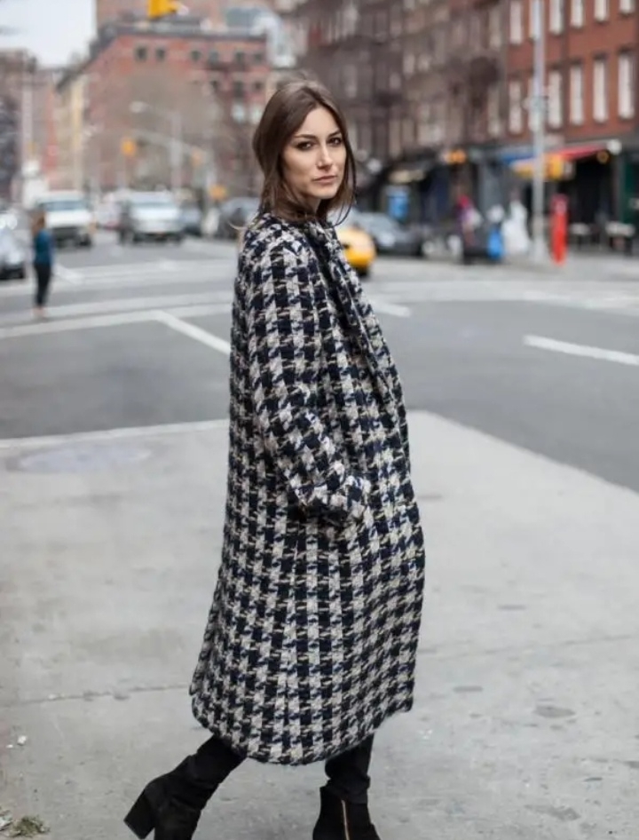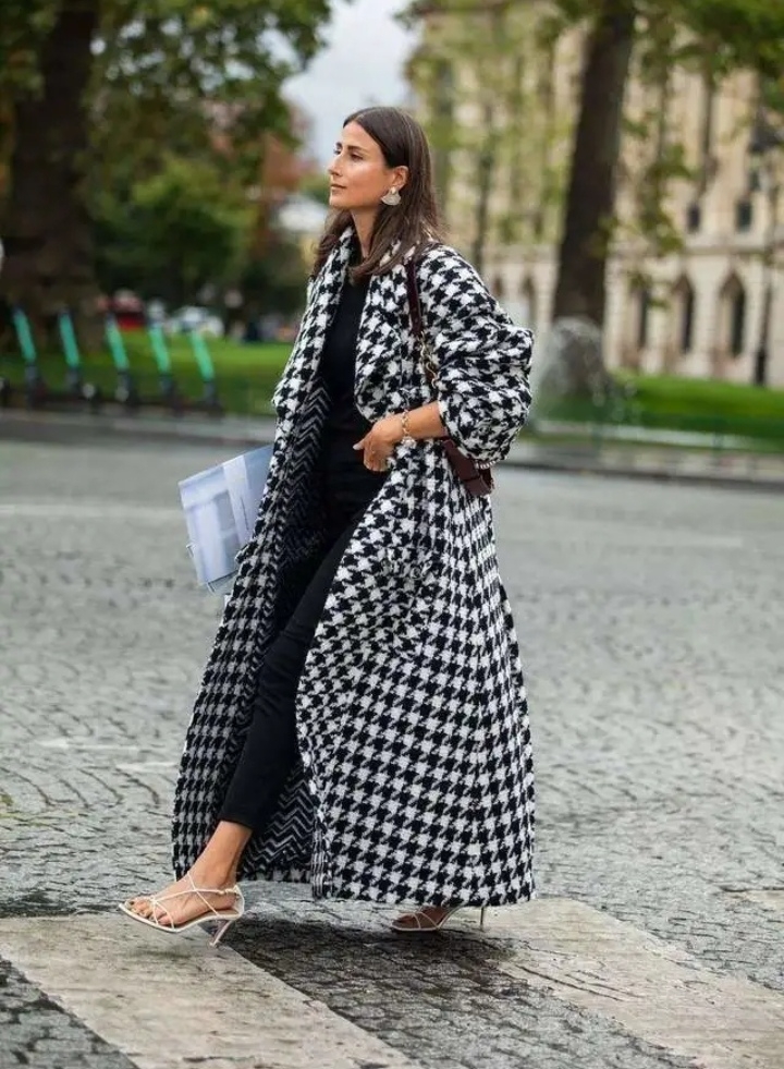 對於格紋大衣的選擇,我會更加的傾向於選擇千鳥格風格的大衣。千鳥格元素為黑白兩色相搭,顏色經典且給人一種歷久彌新的時尚感和滿滿的細節感。