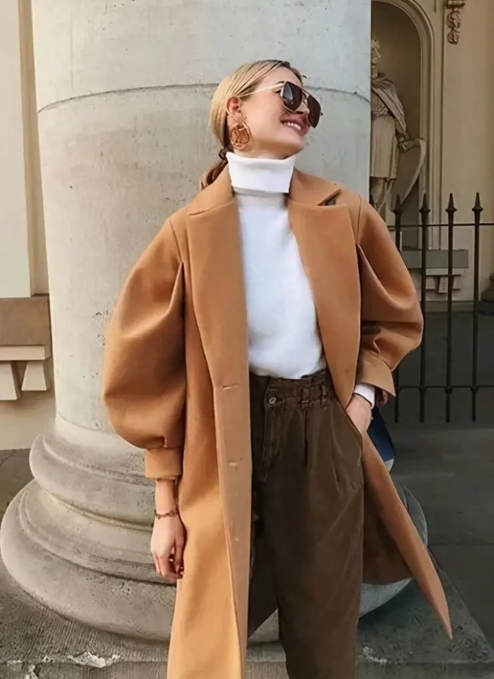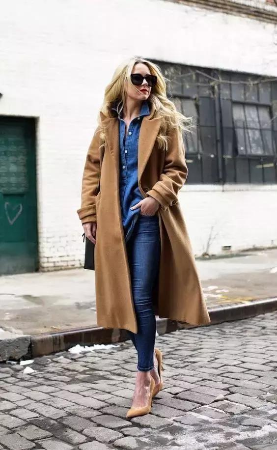 一件長及腳踝款式的大衣在給人帶來溫暖的同時又在不經意間展示出了女性的成熟和優雅,搭配一件黑色的修身毛衣與大衣在色彩上形成呼應,簡約不失經典。無論是選擇牛仔褲還是簡單的黑色長褲,都能展現出一種高端氣質。