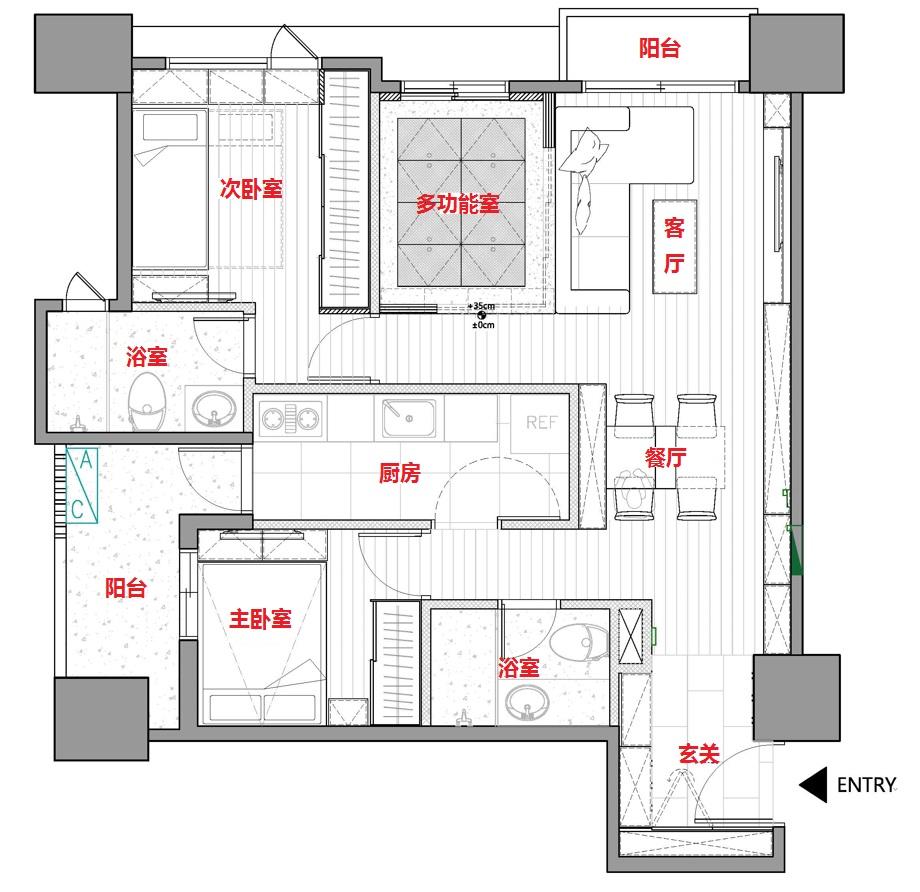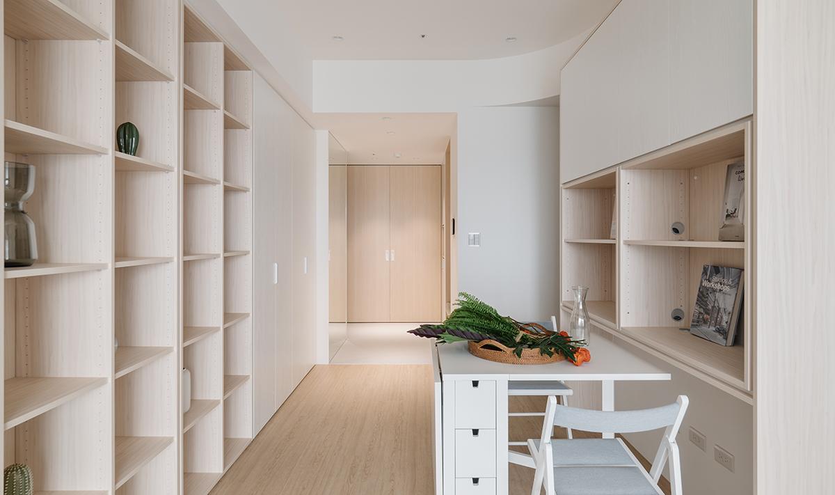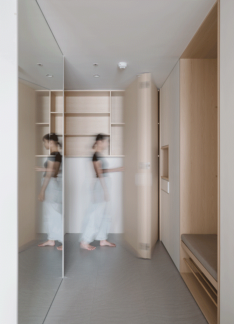 作為進出門的第一站,也是房子給人的第一印象的區域。業界老話說得好,玄關決定了家的使用方式。所以在不影響動線的情況下,利用了門後片刻的空間,加以使用了輔助折疊門,不僅解決了儲物收納功能,還滿足了一家人的使用習慣。
