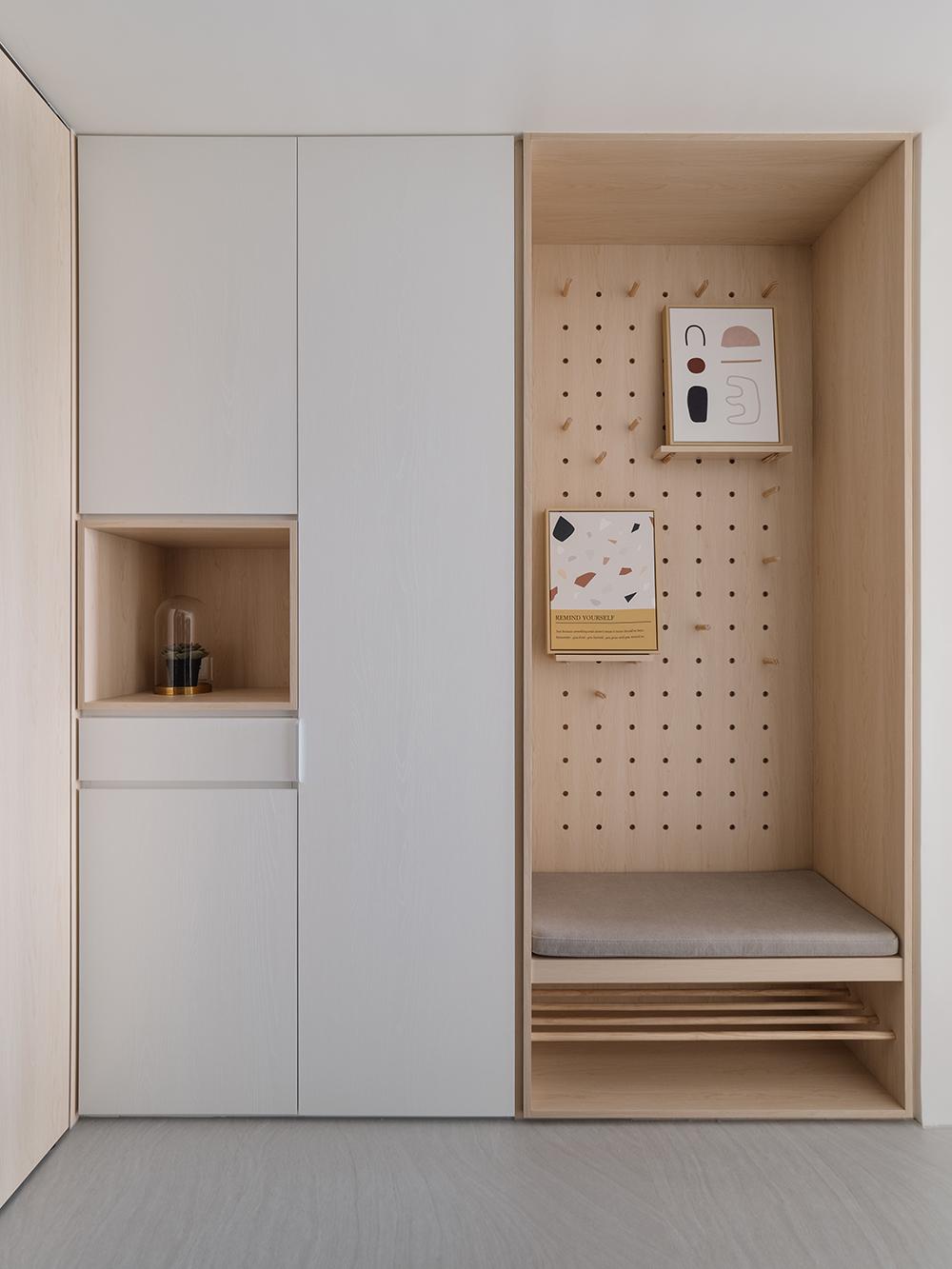 鞋櫃與穿鞋椅填補了掛衣區我,完善了使用功能。而內地分區也是依照家人的使用習慣,把常穿的和不常穿的分類收納定位其中。