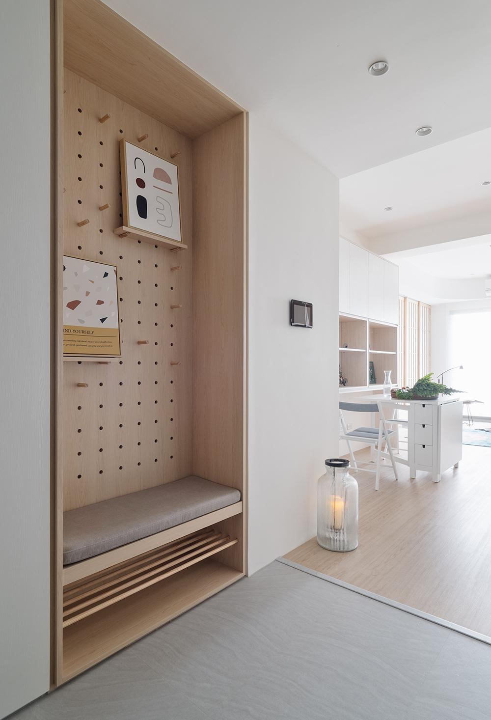 而椅子後面的富有個性化的洞洞板收納區,不僅能展示作畫,為玄關增添一份藝術氣息,也能懸掛我們帽子、包包、鑰匙等隨身物件。