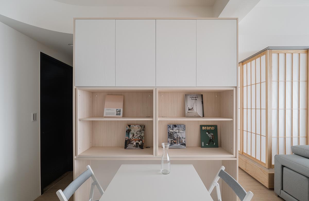 訂製的書牆高櫃和餐廳吊櫃分別在餐桌兩邊,相互呼應對稱。當然餐廳不只是用來吃飯的地方,這裡平常也是看書和工作的地方。