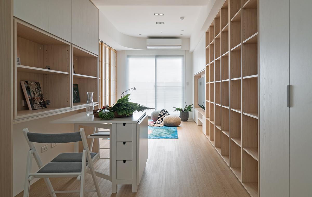 電視牆上同樣採用的是訂製書櫃,封閉式的櫃體下嵌入了75寸大彩電,不僅匯聚了廳區的所有視線,也將家中雜物有序集中收納起來。 多功能室設計