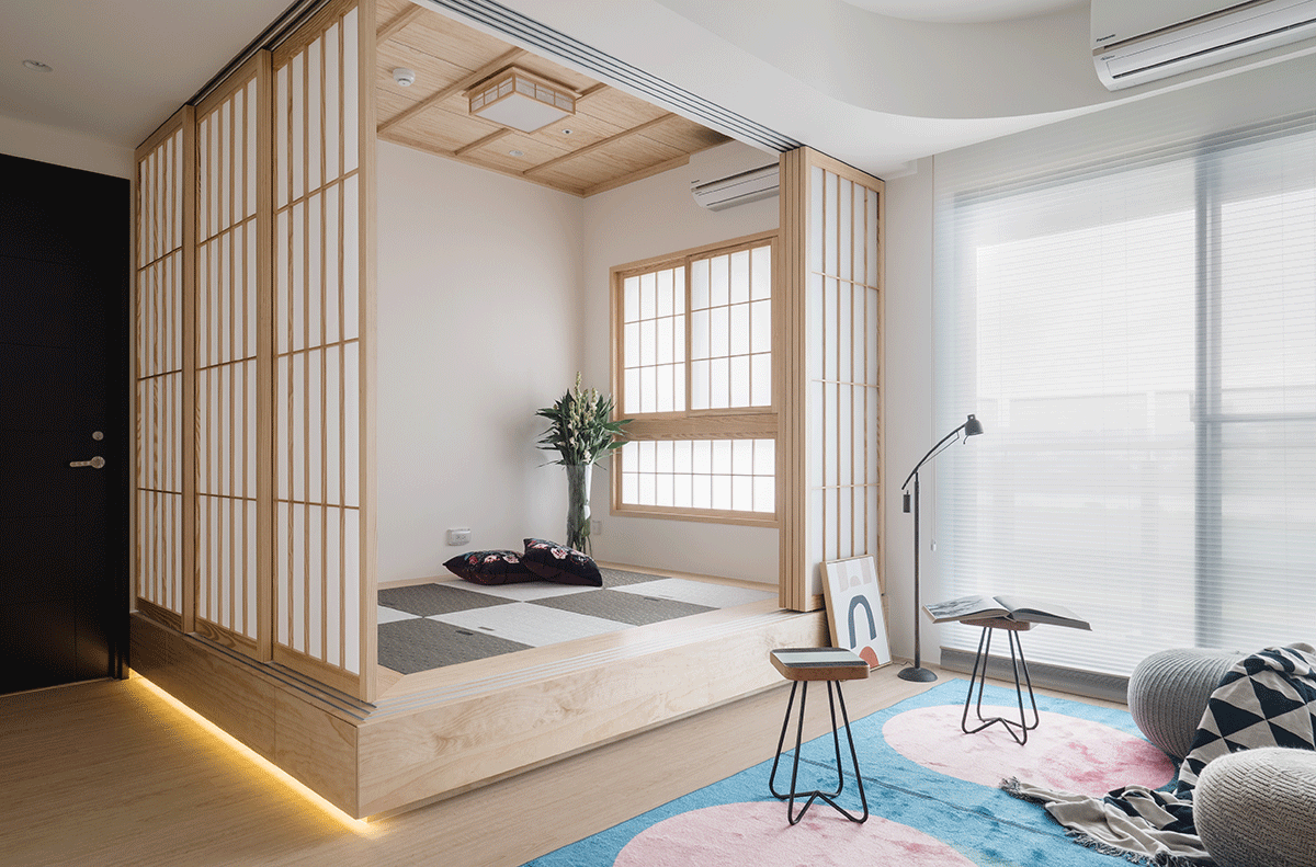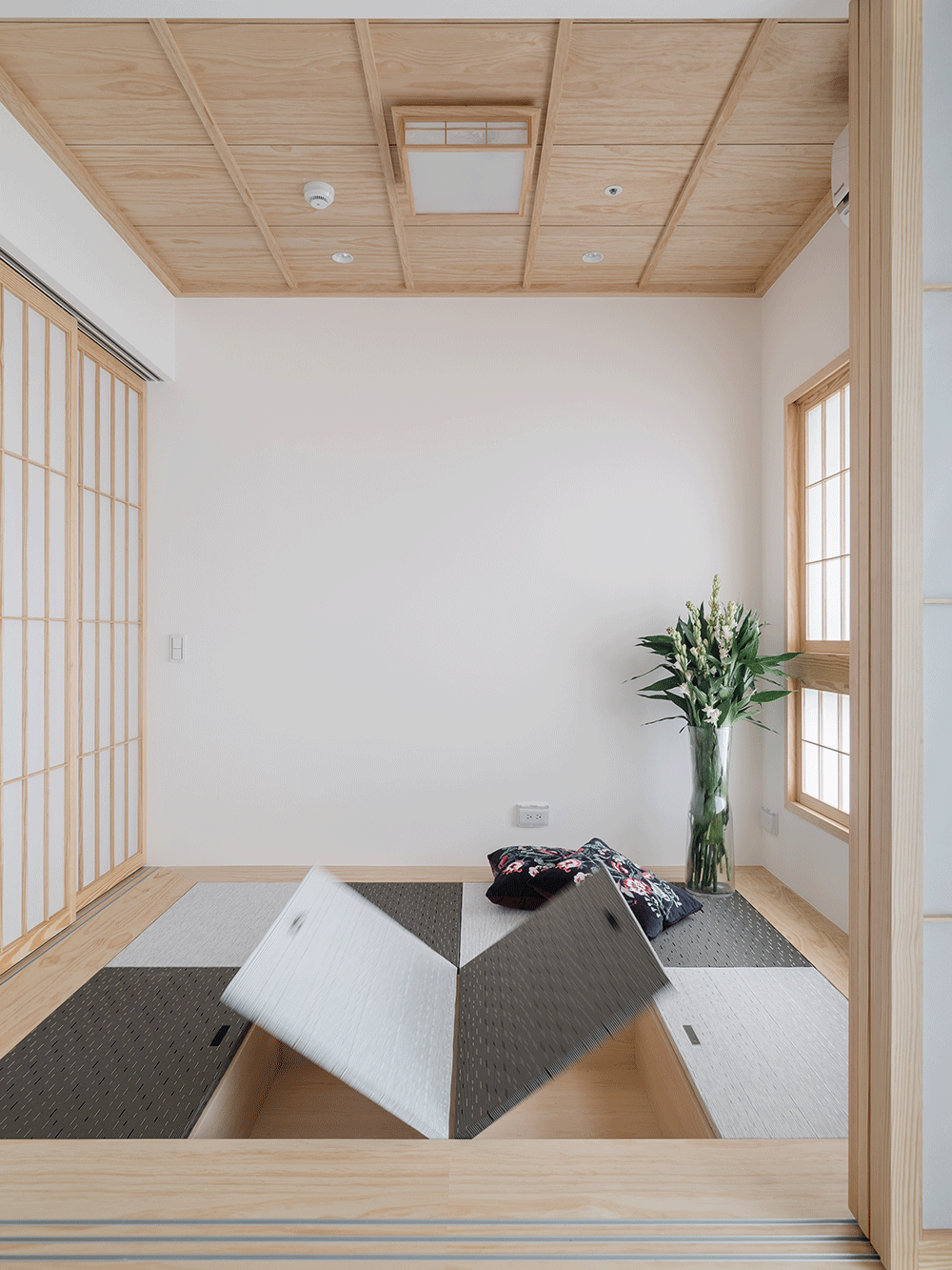 我們學習了日本茶室的設計規則,把那種傳統的和室設計特點加以修飾後,我們一抬頭可以看到木質天花板加上和室的燈具使用,連同和室上的地板也是採用波龍地毯取代藺草榻榻米,具有柔軟和防水的特性,減少了日常的維護成本,提升了席地而坐的舒適性。