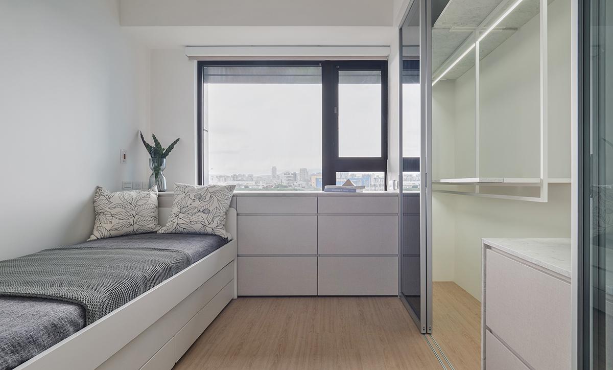 考慮到父母的作息習慣,特別挑選了子母床,方便老人的使用,在靠窗底下定制了一排帶有輪子的矮櫃,讓老人能輕鬆的移動矮櫃。