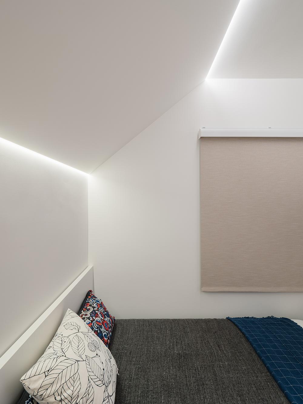 顧及主臥室的空間有限性,只能夠放置一張床和一台衣櫃,收納明顯不足,所以採用了架高床箱來擴充物品收納。斜面的天花板其實修飾了橫樑壓床的忌諱,改以斜面來消弒梁體的銳角,並在交接處安裝了LED燈帶,不僅可以當做誰前閱讀燈使用,也能當做氛圍燈使用,有一次提升了臥室的溫馨舒適感。文章來源: /c/user/token/MS4wLjABAAAAi7egyzK_U_cc6jakZ3UrixDa4tAKySfg-Esvui75pvU/?source=tuwen_detail
