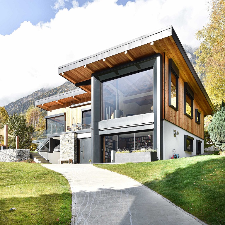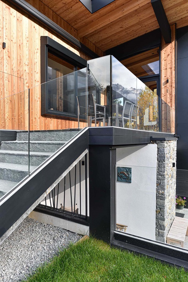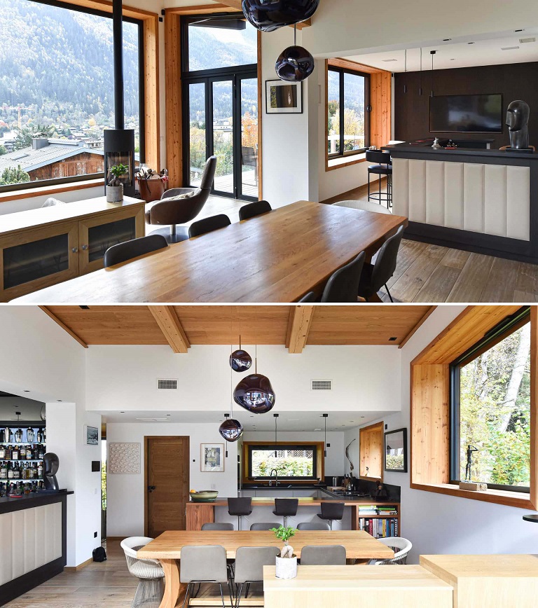 這套私人別墅分為上下兩層,外部的上下層分別採用不同的材質,超大的黑色框架的窗戶不僅可以欣賞窗外的風景,而且和外部的木質壁板形成了鮮明對比。