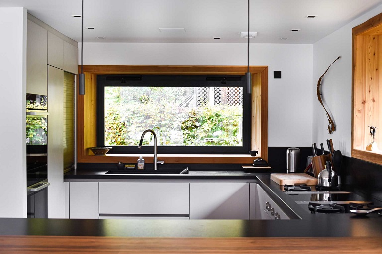 開放式的廚房以U字形格局佈置,把角落的畸零空間合理的運用到位,廚房內黑色的檯面搭配白色櫥櫃形成了鮮明對比,使得整個廚房看起來簡約乾淨起來。