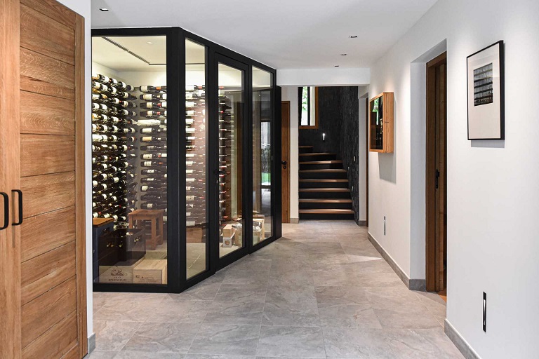 在上樓梯的底部位置,這裡定制了一個玻璃密封的酒窖,收藏了來自世界各地的不同美酒。