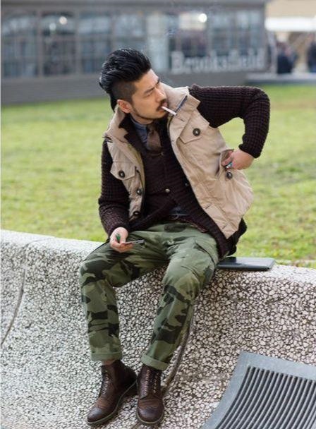 工裝褲搭配工裝靴,從名字就知道合搭,這樣的搭配會給人很酷很man 的感覺。要注意的是,靴子的高度和褲子長度要比例合適(不堆褲腳),再搭配牛仔或軍事風格的上衣單品,帥爆了!