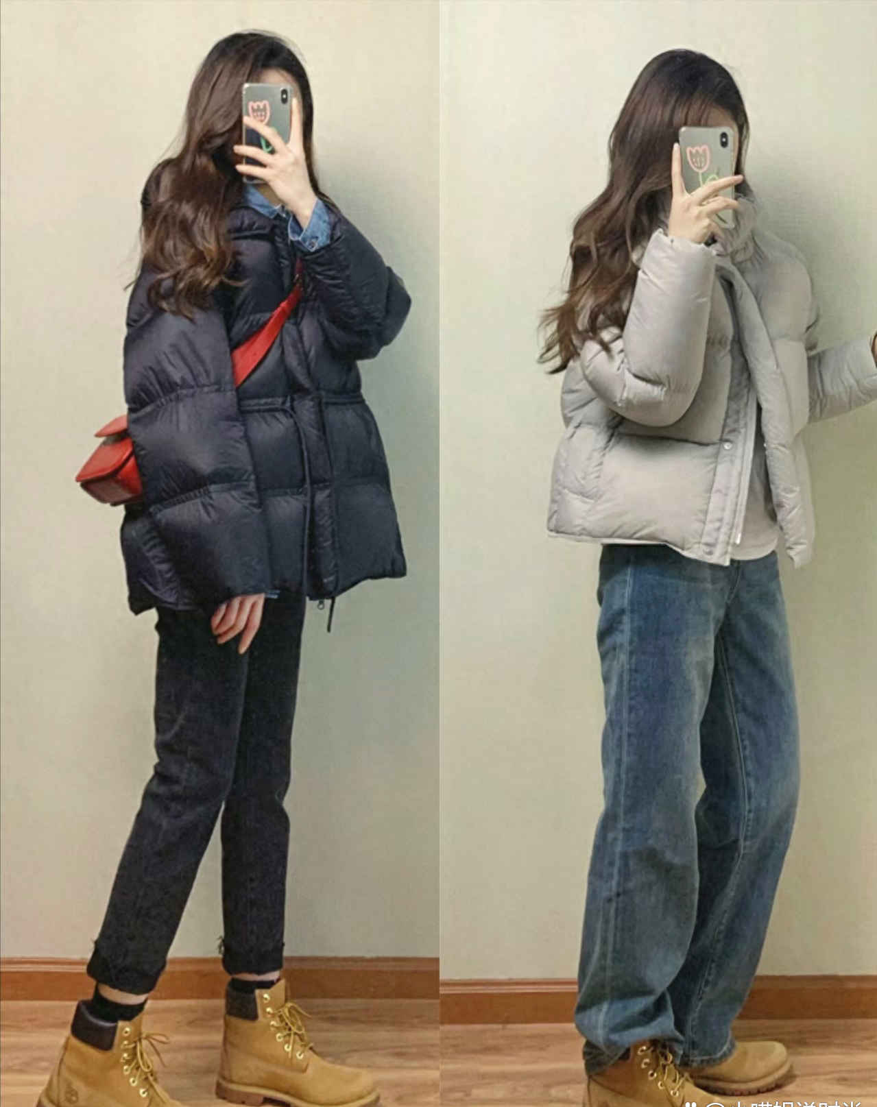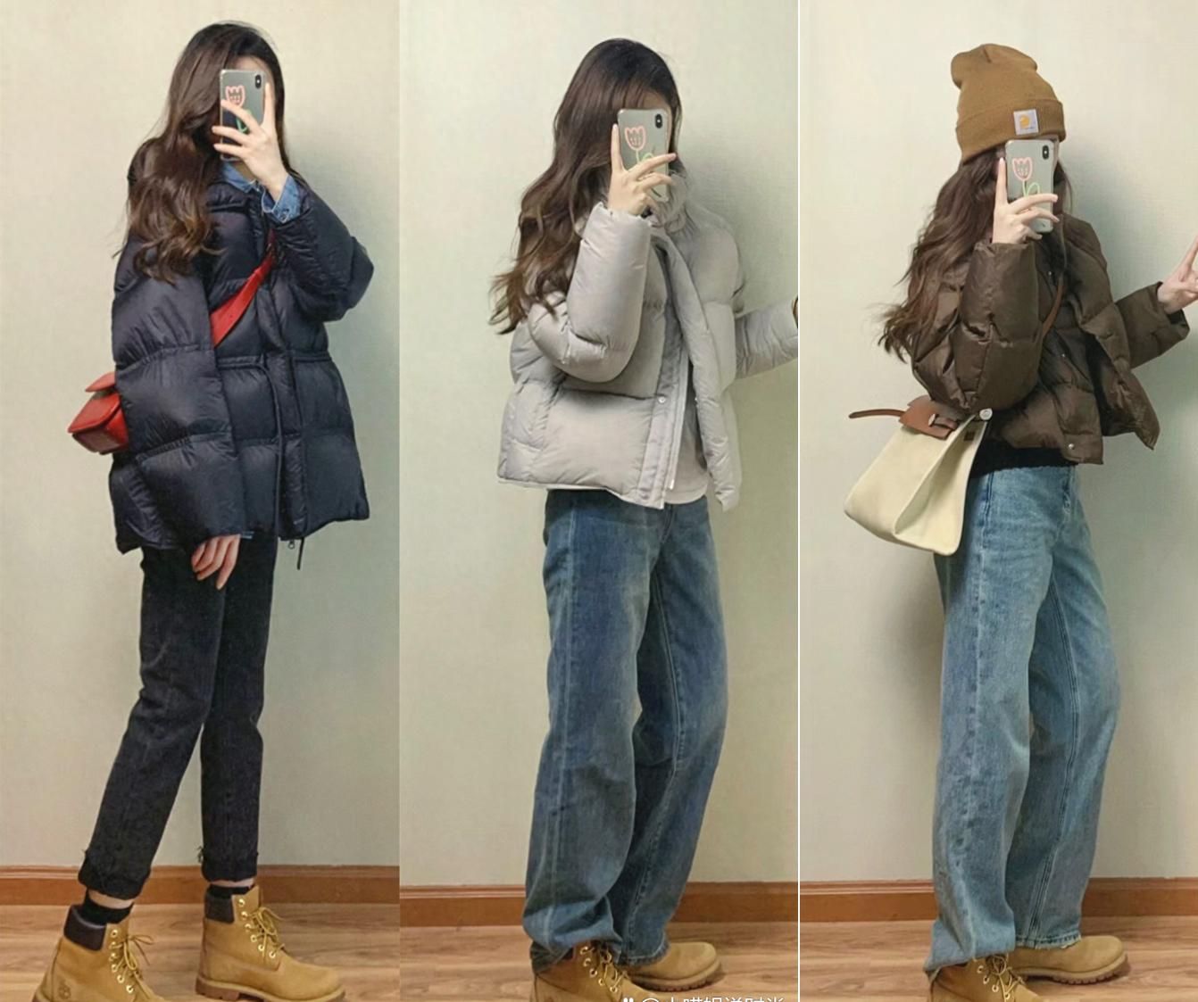 1.羽絨外套+牛仔褲+大黃靴