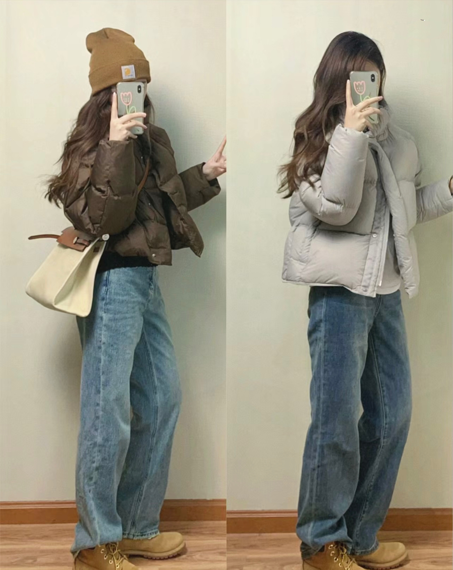 例如這裡的棕色短羽絨外套與牛仔褲和大黃靴的組合,褲子是高腰闊腿拖地設計,上短下長可以更好地拉長比例,以及修飾腿型,非常適合普通人的日常,個性時尚還顯高。如果上衣是中長的設計,可以選擇一條窄腿牛仔褲來搭配大黃靴,把褲腳塞進靴筒俐落顯瘦。