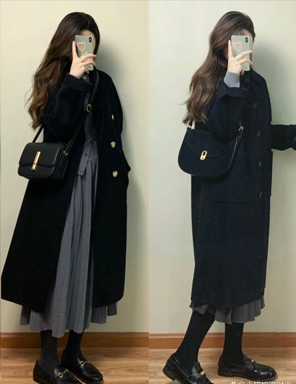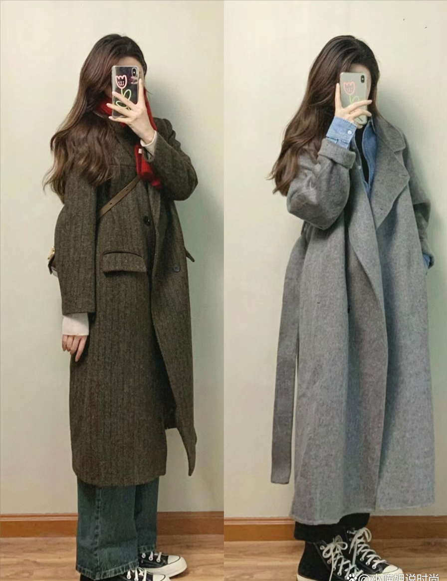 長大衣的穿搭大家都不陌生了,它優雅大氣,也是微胖女生修飾身材的首選。通勤約會可以模仿博主,選擇百褶裙、打底襪和樂福鞋,打造減齡優雅學院風。上寬下窄的輪廓也可以很好的修飾身材比例,是小個子也能駕馭的公式。