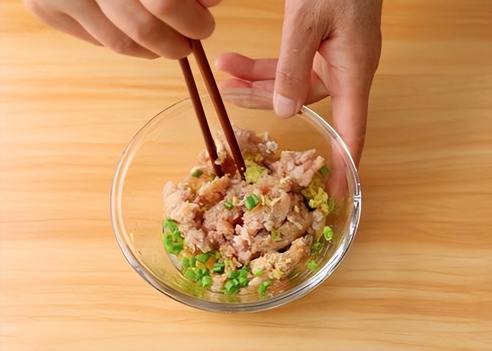 2.大碗中放入豬絞肉,加入蔥花、薑泥、香油、白胡椒粉、鹽、蛋白、1大匙清水拌勻,順著同一方向攪打至黏稠。