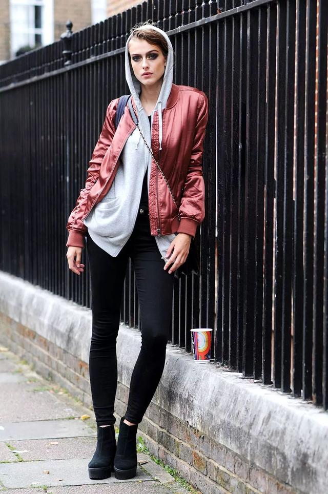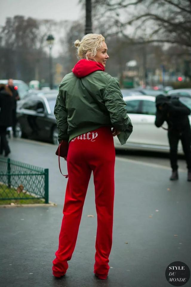 只要挑選明度和純度較暗的色彩,紅+綠也可以很時髦!墨綠的短夾克很好的分割了身材比例,衛衣帽子的紅色與褲子相呼應,太有格調了!