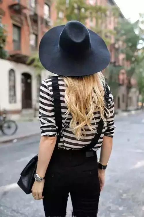 背帶褲+條紋衫學院風十足,小西服的加入幹練有氣場。▼