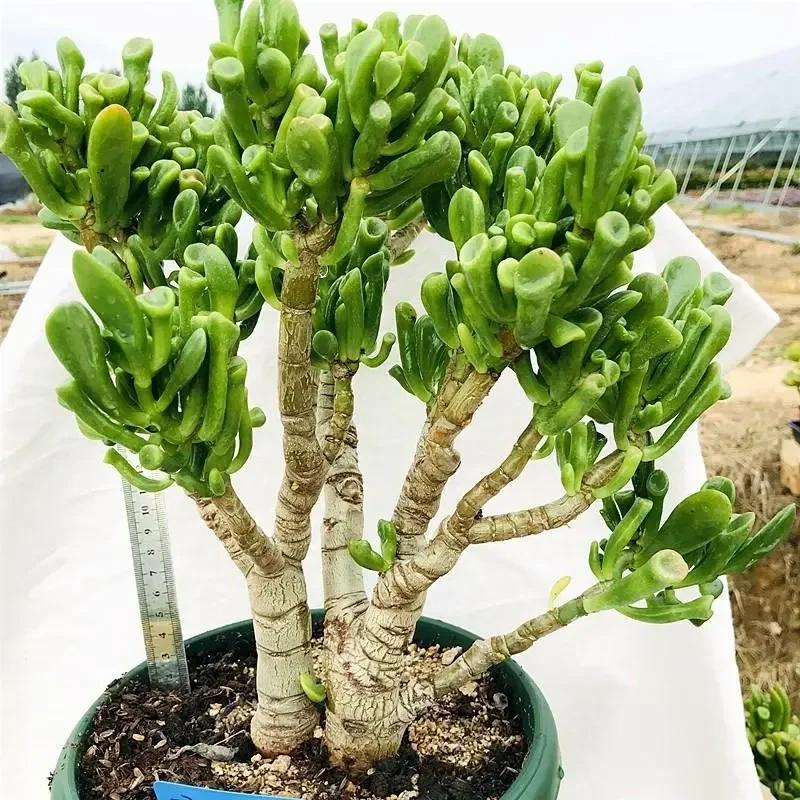 它是景天科的植物,其養護方法和玉樹相似。它的葉子形狀獨特,像一根粗壯的吸管,中間凹陷,彷彿能吸取財富,所以得名吸財樹,財源滾滾。它代表招財納福、財源廣進,其植株可以長得極為碩大,長時間養護後,就像一棵盆景,獨特的葉子在陽光下呈現出黃綠色,顯得特別的氣勢磅礴,像是金碧輝煌的富貴象徵。 筒葉花月的養護方法也非常簡單,雖然因為它